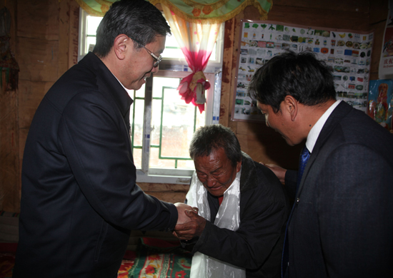2012年4月27日,在波密县玉许乡海定村,自治区政府党组成员、区发展改革委主任金世洵走访慰问低保户央青措姆老人一家。