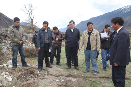 2012年4月27日,自治区政府党组成员、区发展改革委主任金世洵在波密县玉许乡亚塔村察看核桃基地建设情况。