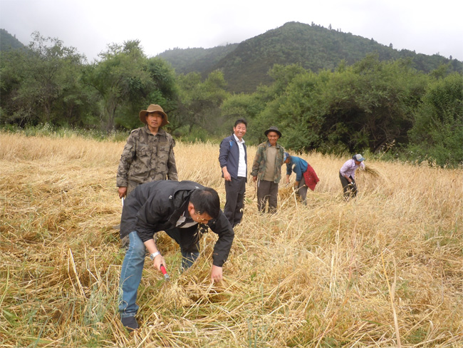 波密县玉许乡麦差村驻村工作队组织村民帮助低保户阿鲁玛家抢收青稞