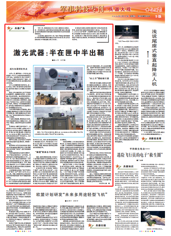 进度各不相同,大多处于测试阶段,部分已经投入使用。总的来说,“聚焦未来战场”的激光武器,由于需破解的技术难题较多,基本上处于测试阶段。一些为“满足当下需要”研发的激光武器,则半在匣中半出鞘。这些激光武器有效毁伤距离大多在数千米至数十千米之间,主要用于打击小型低成本目标,如各型无人机、火箭弹、迫击炮弹以及小型水面快艇等。其中,以色列的首套“铁束”激光武器防空系统,前不久正式交付其防空部队,步入实战部署阶段。美海军则对搭载在普雷布尔号驱逐舰上的HELIOS系统进行了首次海上动态跟踪测试,并计划在今年对其拦截小型船只的能力进行评估。