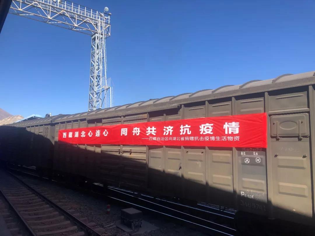 挂着“西藏湖北心连心 同舟共济抗疫情”的横幅的棚车