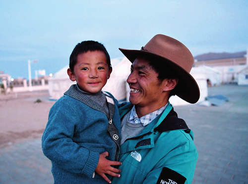 在西藏贡嘎县森 布 日 极 高 海 拔地区生态搬迁安置点,格多(右)抱着大儿子扎西尼玛在帐篷甜茶馆前合影(4 月 15 日摄)詹彦摄 / 本刊