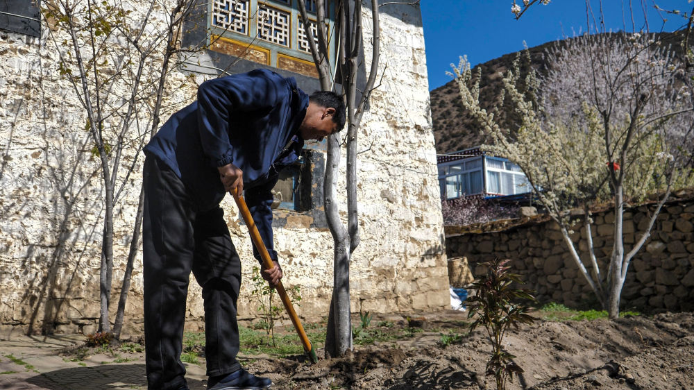 格桑旺久家里如今有两栋老房子和一栋新的二层小楼,新房几十平方米的院子里种满了各种果树和蔬菜。春风吹过,开着粉白两色桃花的树林沙沙响着,坐在院子中还隐隐可以听到村中建设新房子的声音。格桑旺久准备过几年经营家庭旅馆,也沾沾旅游发展的光。