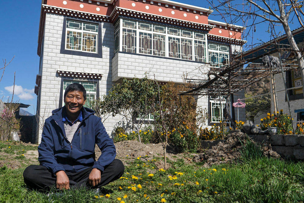 这是村民格桑旺久在自家新房前(2021年4月6日摄)。