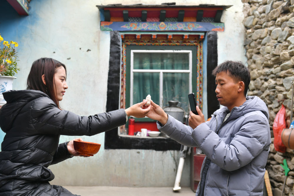 扎西拉姆(左)把刚揉好的糌粑递给拍摄短视频的丈夫田辉(4月2日摄)。