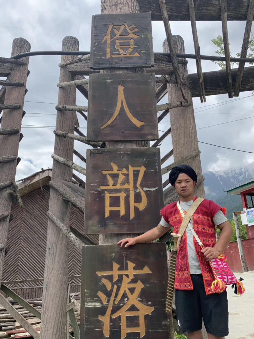 迪龙身着僜人传统服饰站在村庄门口。 新华社发