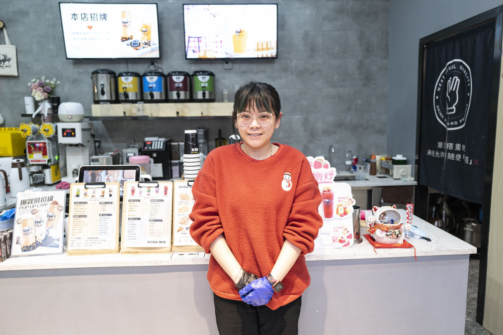 澳门姑娘邵颖怡站在自己位于拉萨的奶茶店里(5月6日摄)。