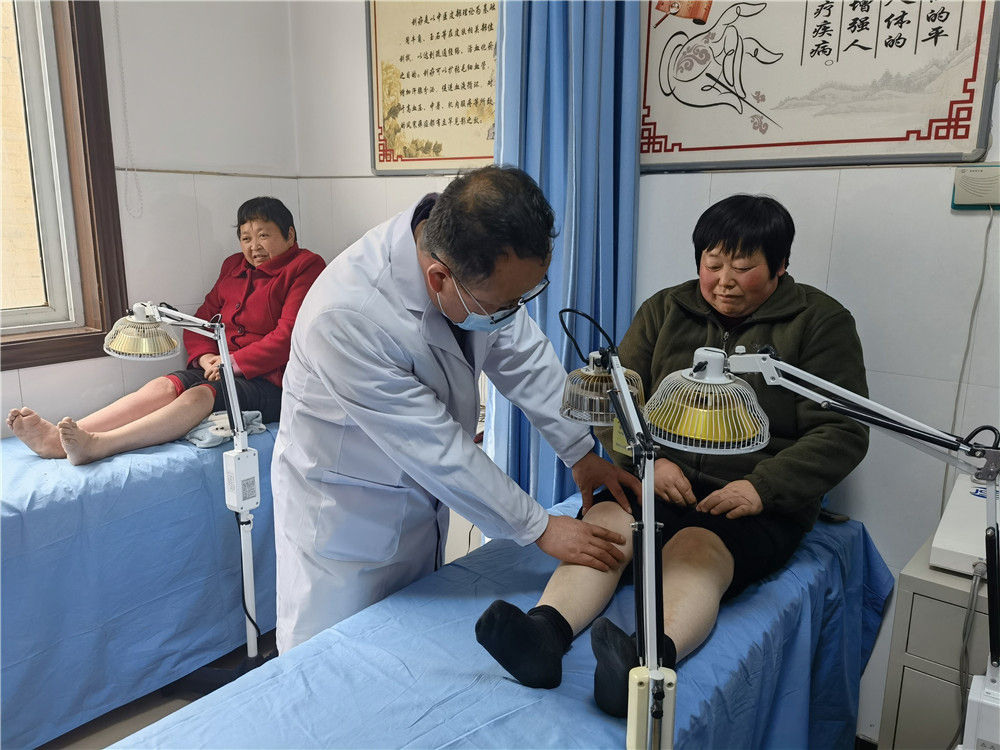 陕西省宝鸡市麟游县崔木镇中心卫生院内,医生为大骨节病患者进行中医理疗(4月6日摄)。新华社记者 蔺娟 摄