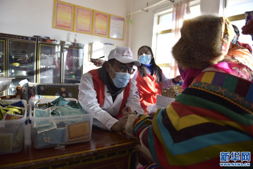 西藏尼玛县新时代文明实践中心志愿者在尼玛县五保集中供养服务中心进行义诊(2021年2月3日摄)。新华社记者 格桑朗杰 摄