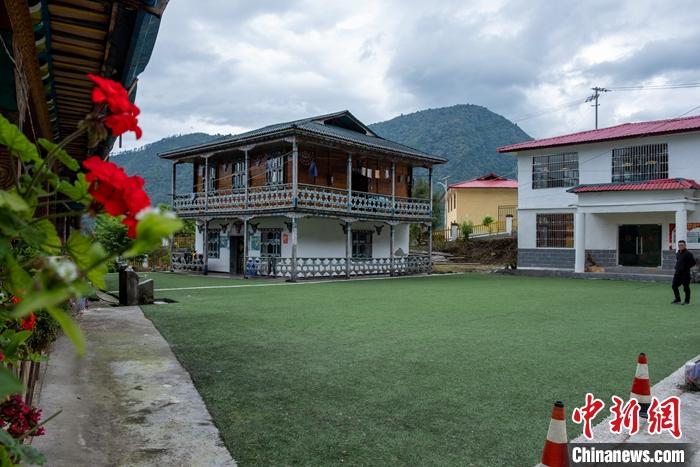 画面右侧为商店,中间的建筑是住宿的旅店,左侧为扎西自办的猎人博物馆。 中新社记者 江飞波 摄