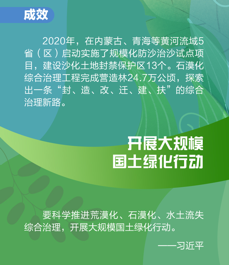 “人类只有一个地球家园。荒漠化防治是关系人类永续发展的伟大事业。”党的十八大以来,各地区、各部门深入贯彻习近平生态文明思想,牢固树立绿水青山就是金山银山理念,统筹山水林田湖草沙系统治理,深入推进大规模国土绿化行动,国土绿化事业取得新进展新成效。