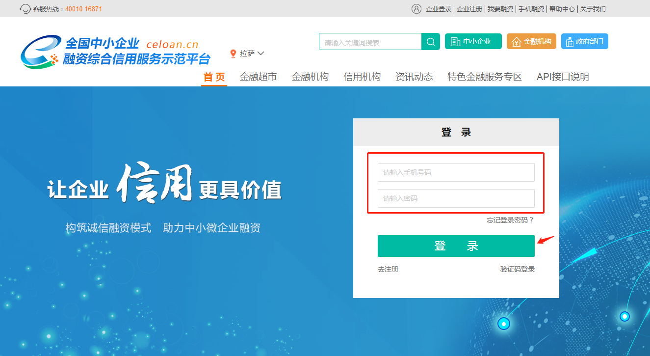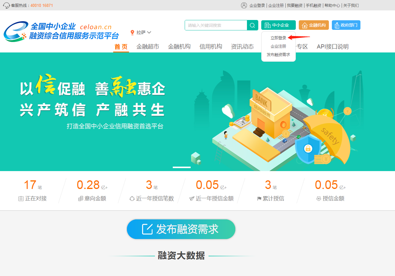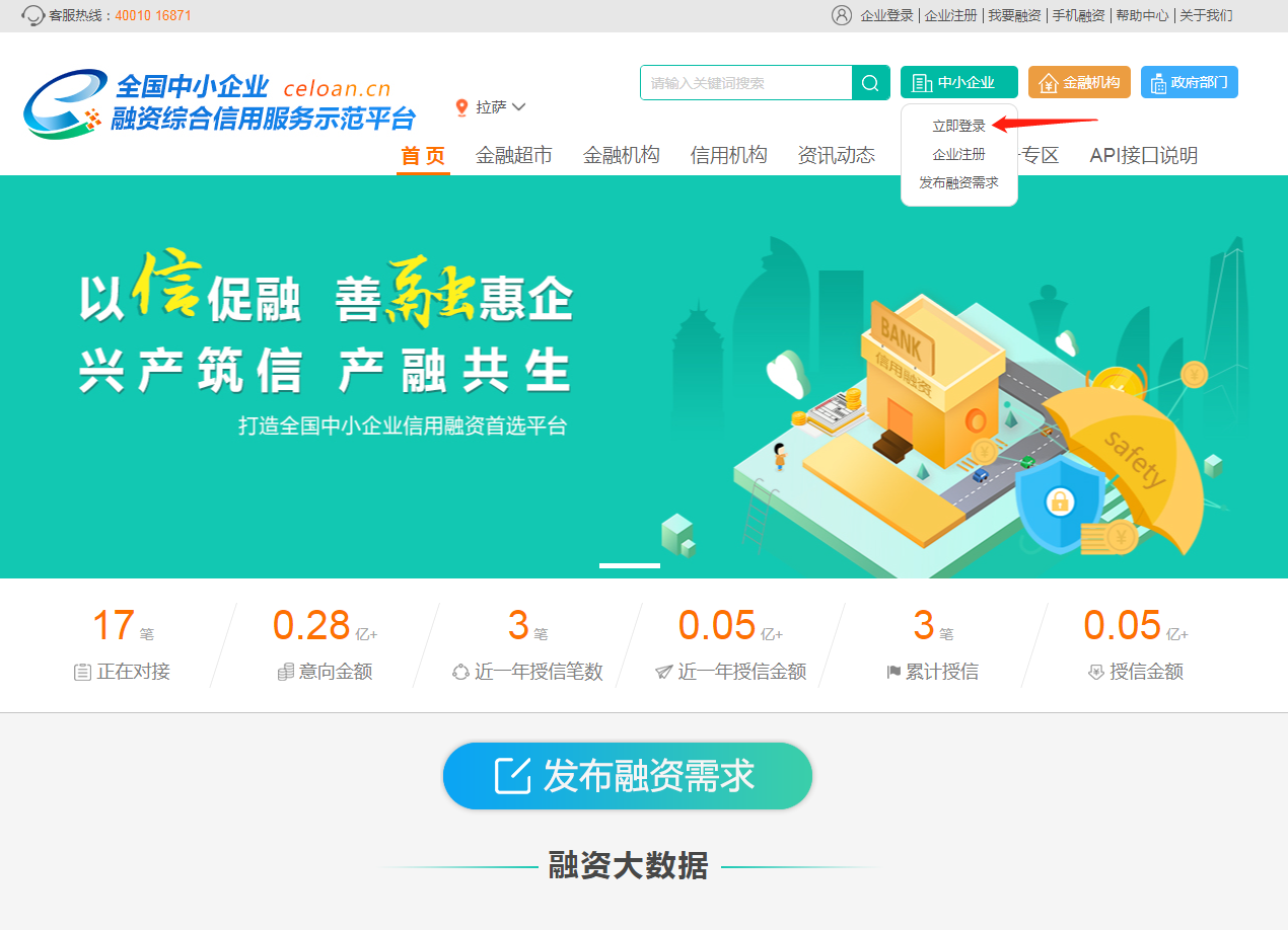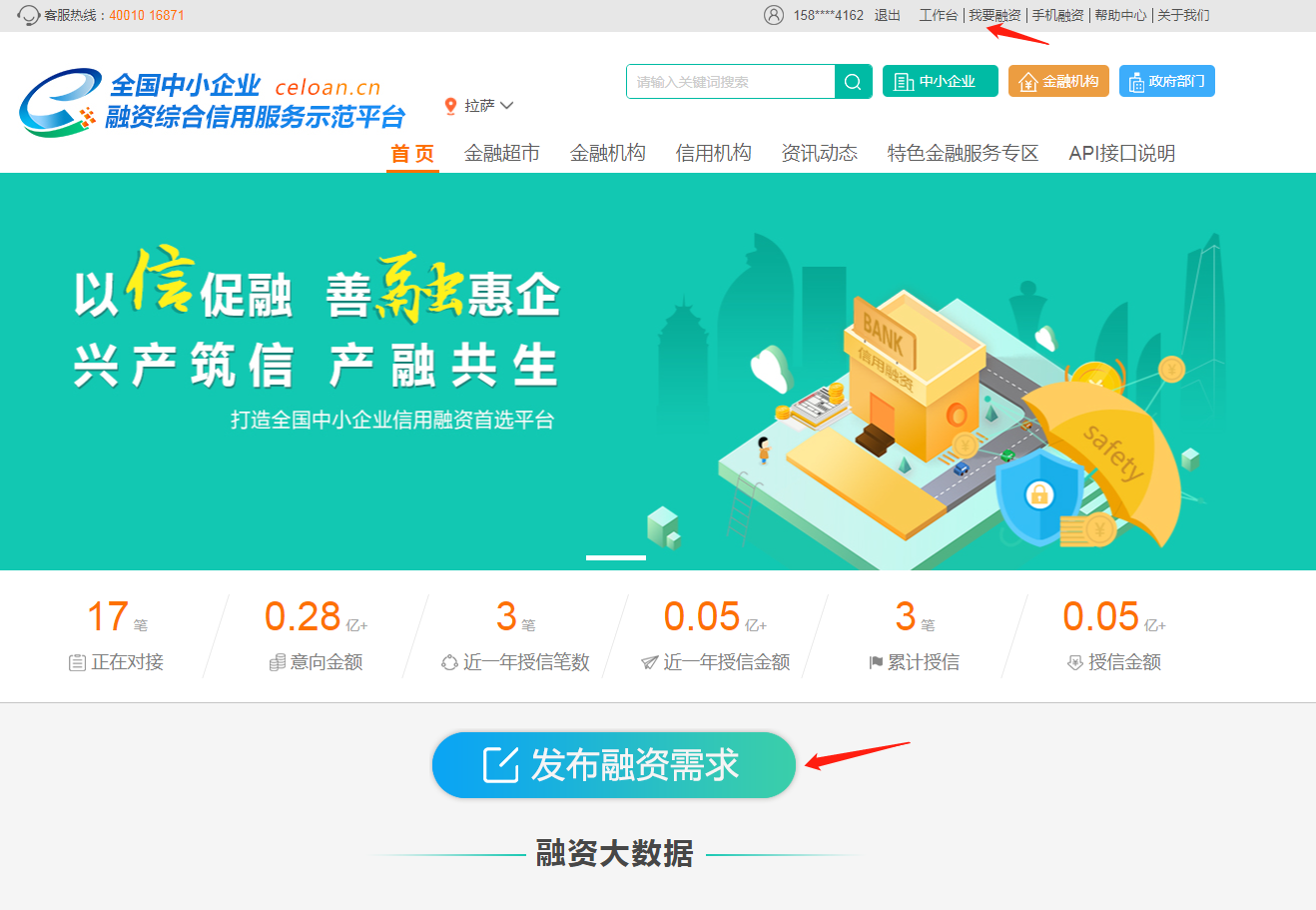 1、登录成功后,跳转首页,点击网站右上角“我要融资”或网站首页“发布融资需求”按钮。