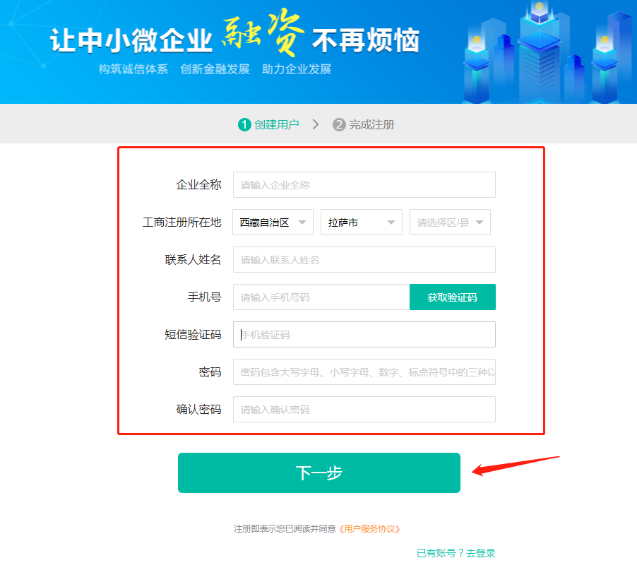 3、填写企业信息(企业全称、工商注册所在地、联系人姓名、手机号、短信验证码、密码、确认密码),填写完成后点击“下一步”按钮,完成注册。