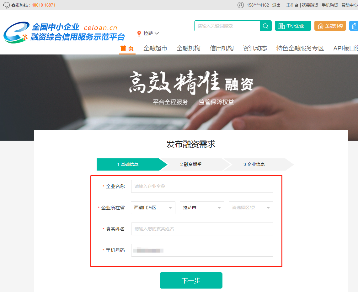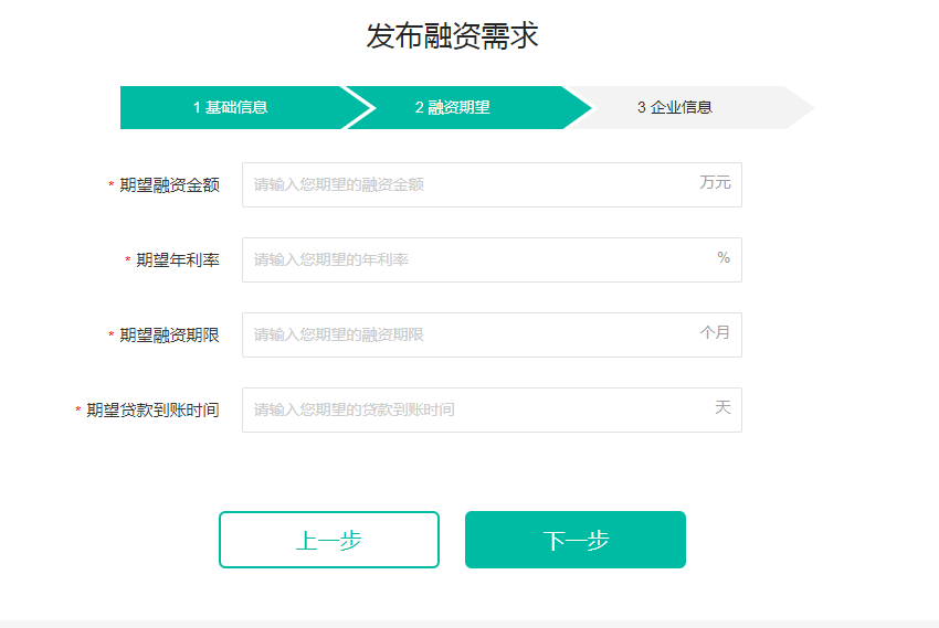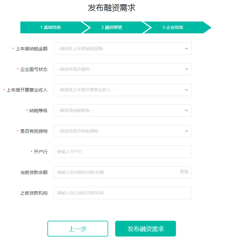 2、填写企业基础信息(图1),点击“下一步”按钮,填写融资期望信息(图2),点击“下一步”按钮,填写企业信息(图3),填写完成后,点击“发布融资需求”。备注:发布融资需求后,相关金融机构会收到企业发布的融资需求,根据企业的相关信息综合评判是否发放贷款。