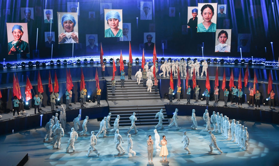 2021年6月26日,在武汉举行的湖北省庆祝中国共产党成立100周年文艺晚会上再现抗疫英雄群像。