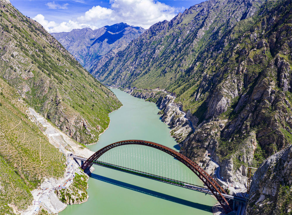 6月25日,全长435公里、设计时速160公里的拉林铁路建成通车,西藏首条电气化铁路建成,同时复兴号实现对31个省区市全覆盖。这是试运行的复兴号列车行驶在藏木特大桥(无人机照片,6月17日摄)。新华社记者 普布扎西 摄