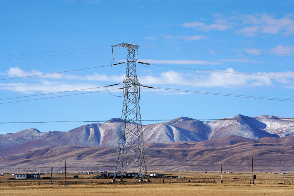 这是在西藏阿里地区普兰县拍摄的西藏阿里与藏中电网联网工程输电铁塔(2020年11月29日摄)。新华社记者 詹彦 摄