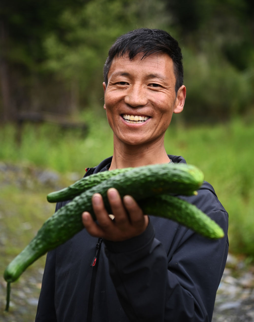 西藏山南市隆子县玉麦乡村民展示大棚里采摘的黄瓜,这些黄瓜将通过合作社销往各地(2020年7月30日摄)。新华社记者 普布扎西 摄