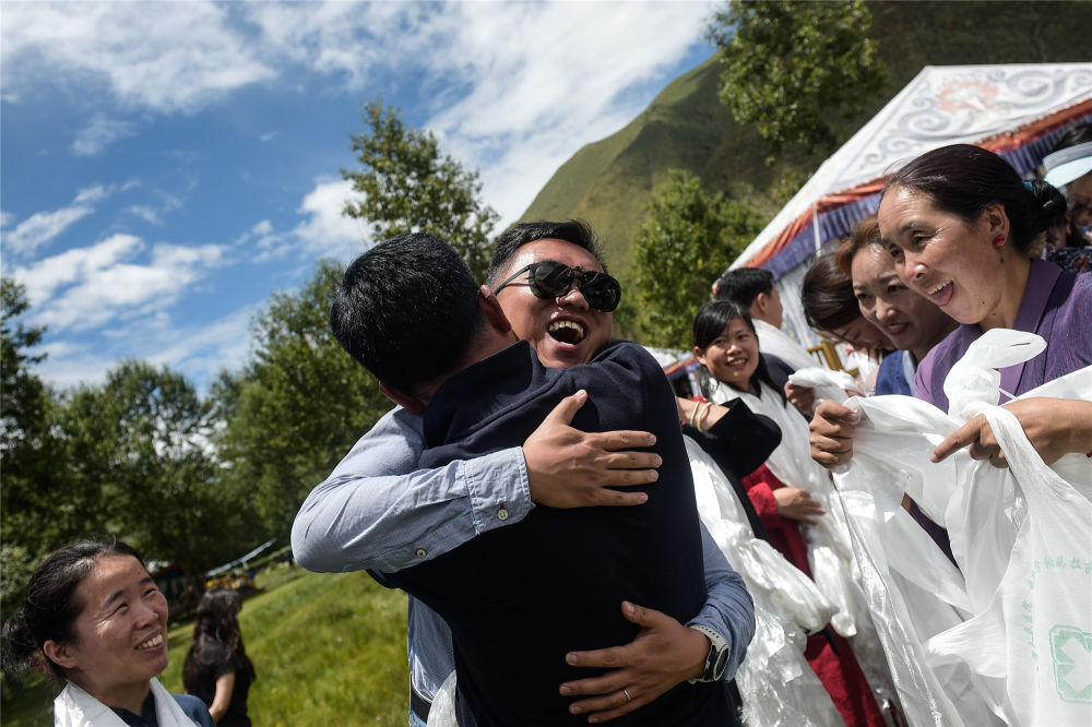 在西藏拉萨市达孜区,北京大学肿瘤医院的援藏医生袁灿(戴墨镜者)与送别的藏族同事拥抱(2020年8月1日摄)。新华社记者 彭子洋 摄
