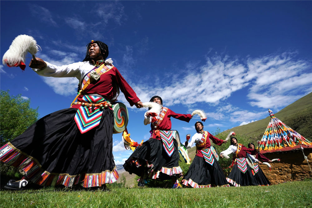 在山南市琼结县,久河村卓舞队的队员在表演国家级非遗项目“久河卓舞”(2020年7月1日摄)。新华社记者 詹彦 摄