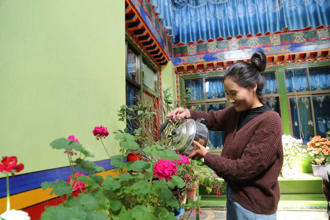 哼唱着欢快的小曲,白玛琼达细心地打理着阳光房内的花花草草,儿子旺久云丹则在一旁摆弄着自己的玩具。“这些鲜花绿植都是这两年才陆续买回来的,家具也都是新买的。前几年也想装扮一下家里,是既缺钱也没精力。”白玛琼达说。