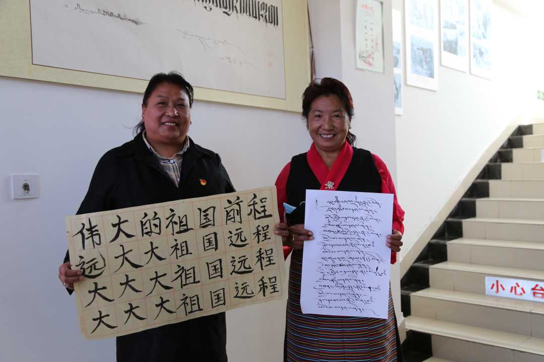 村民索朗卓嘎(左)和穷达展示各自的书法作品 贺建明摄