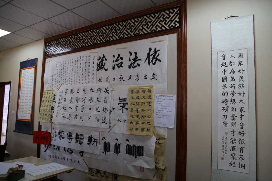 蔡村活动室内,由村民书写挂满墙面的的书法作品 贺建明摄