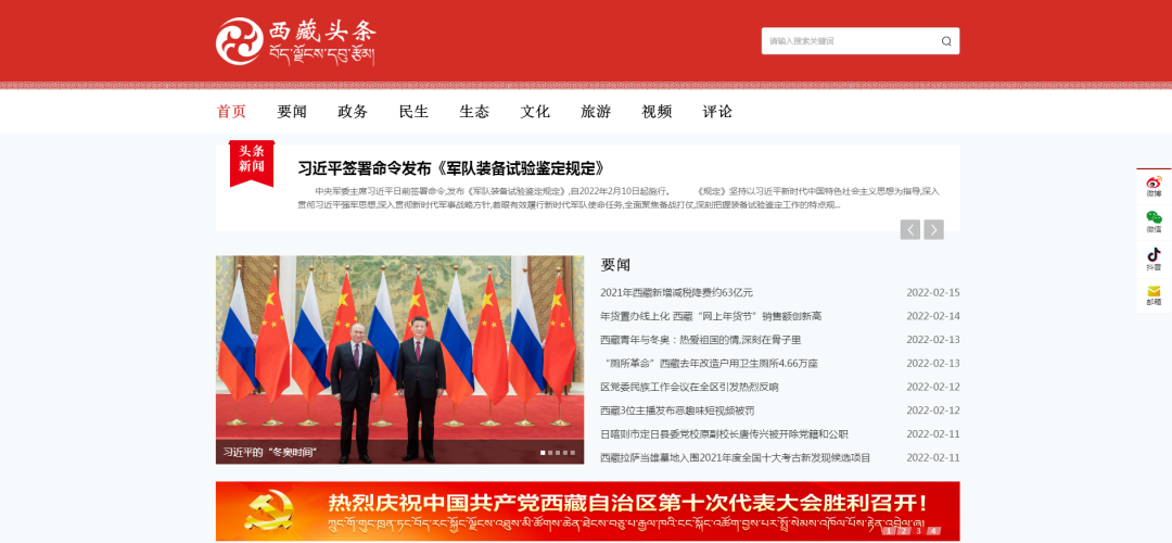 “西藏头条”新闻网站共分要闻、政务、民生、生态、文化、旅游、视频、评论8个栏目。