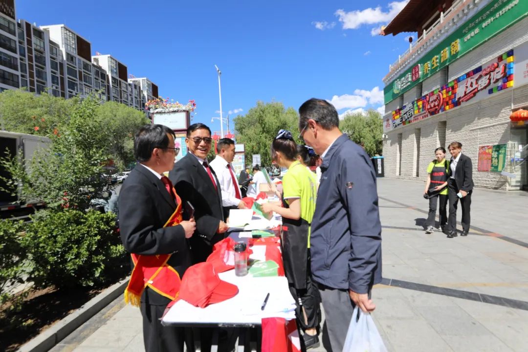 在宣传现场,通过悬挂横幅、口头宣讲、发放普法宣传资料、提供法律咨询等方式,向人民群众深入浅出讲解“绿水青山就是金山银山”“冰天雪地也是金山银山”的理念,广泛宣讲自治区党委“四个创建”“四个走在前列”宏伟蓝图,特别是全面宣讲自治区创建国家生态文明高地具体目标任务,积极讲解《民法典》、《环境保护法》、《西藏自治区国家生态文明高地建设条例》,《拉鲁湿地管理条例》等法律法规,详细介绍拉萨南北山绿化等重大生态保护工程,细心解答前来咨询群众提出的生态环境方面法律问题,引来过往群众纷纷驻足观看,听取讲解,气氛十分热烈。宣传现场共发放各类资料100多份、印有环境保护标语手提袋50余个,提供法咨询8人次。