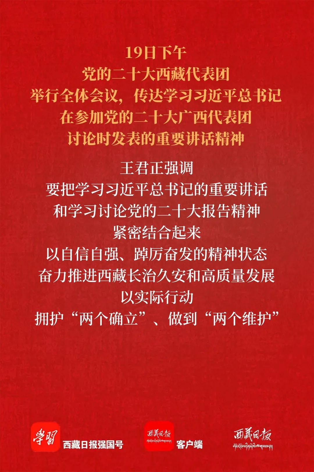 19日下午,党的二十大西藏代表团举行全体会议,传达学习习近平总书记在参加党的二十大广西代表团讨论时发表的重要讲话精神。自治区党委书记王君正主持会议并讲话。强调,全体代表、全区广大党员干部要把学习习近平总书记的重要讲话和学习讨论党的二十大报告精神紧密结合起来,按照“五个牢牢把握”重要要求,自觉掌握贯穿其中的世界观、方法论,用党的创新理论武装头脑、指导实践、推动工作,集中精力做好经济社会发展各项工作,以自信自强、踔厉奋发的精神状态奋力推进西藏长治久安和高质量发展,以实际行动拥护“两个确立”、做到“两个维护”。