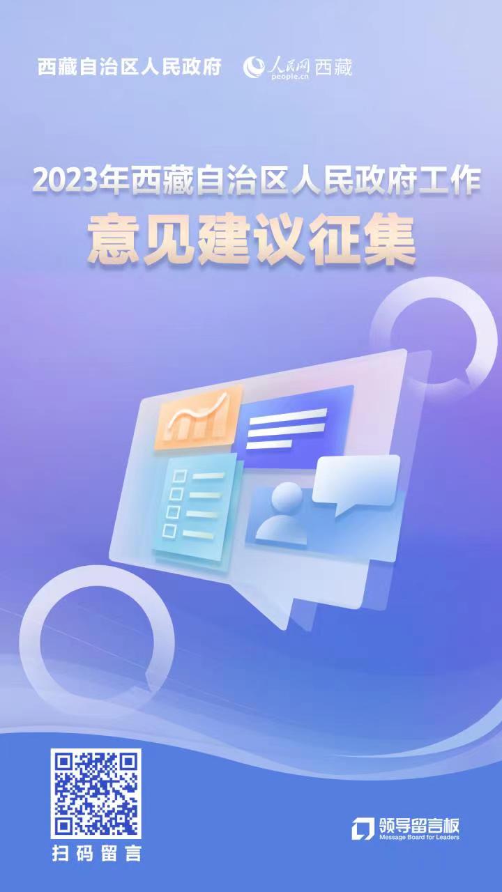 人民网拉萨10月25日电 (吴雨仁)江山就是人民,人民就是江山。为全面贯彻党的二十大精神,深入落实西藏自治区第十次党代会精神,切实提升政府决策科学化、民主化水平,增强政府决策透明度和公众参与度,从2022年10月25日至12月20日,西藏自治区人民政府联合人民网依托“领导留言板”开通政府工作征求意见栏,面向社会公开征集关于2023年全年工作的具体意见及未来五年的总体建议。