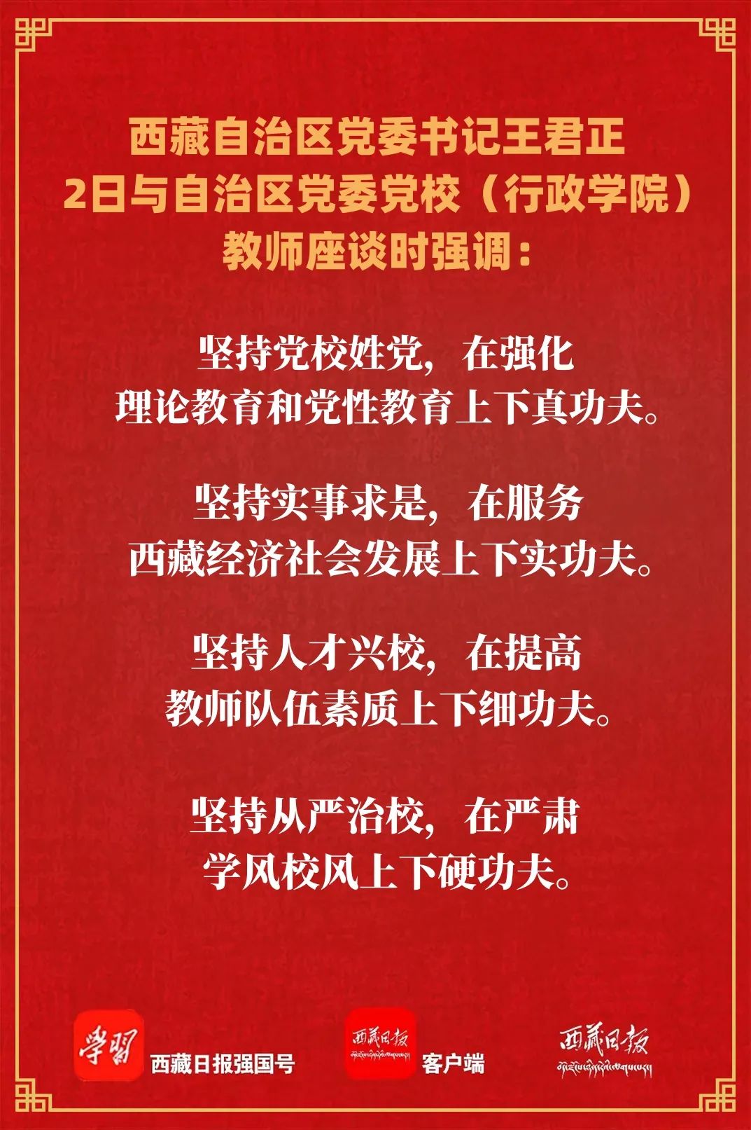 11月2日下午,自治区党委书记王君正与自治区党委党校(行政学院)教师进行座谈。强调,要认真做好学习宣传贯彻党的二十大精神各项工作,充分发挥党校党的理论教育主阵地、干部培训主渠道作用,总结经验、巩固成果,立足实际、突出特色,不断提高新时代党校办学水平,为西藏长治久安和高质量发展贡献力量。