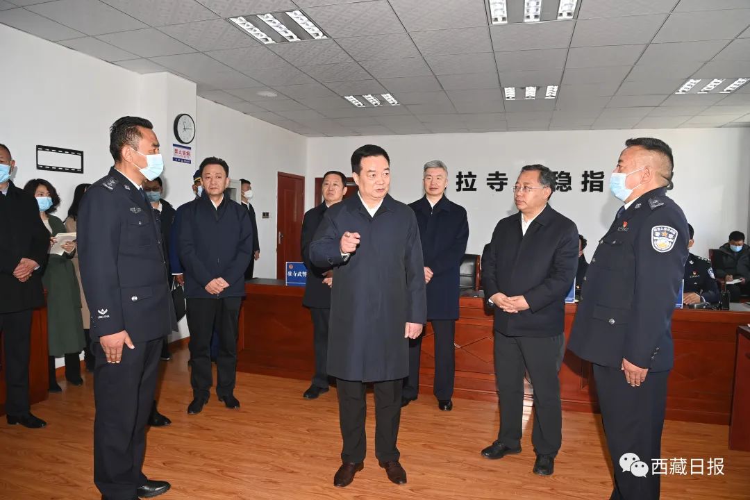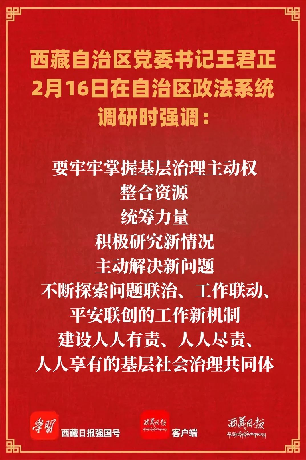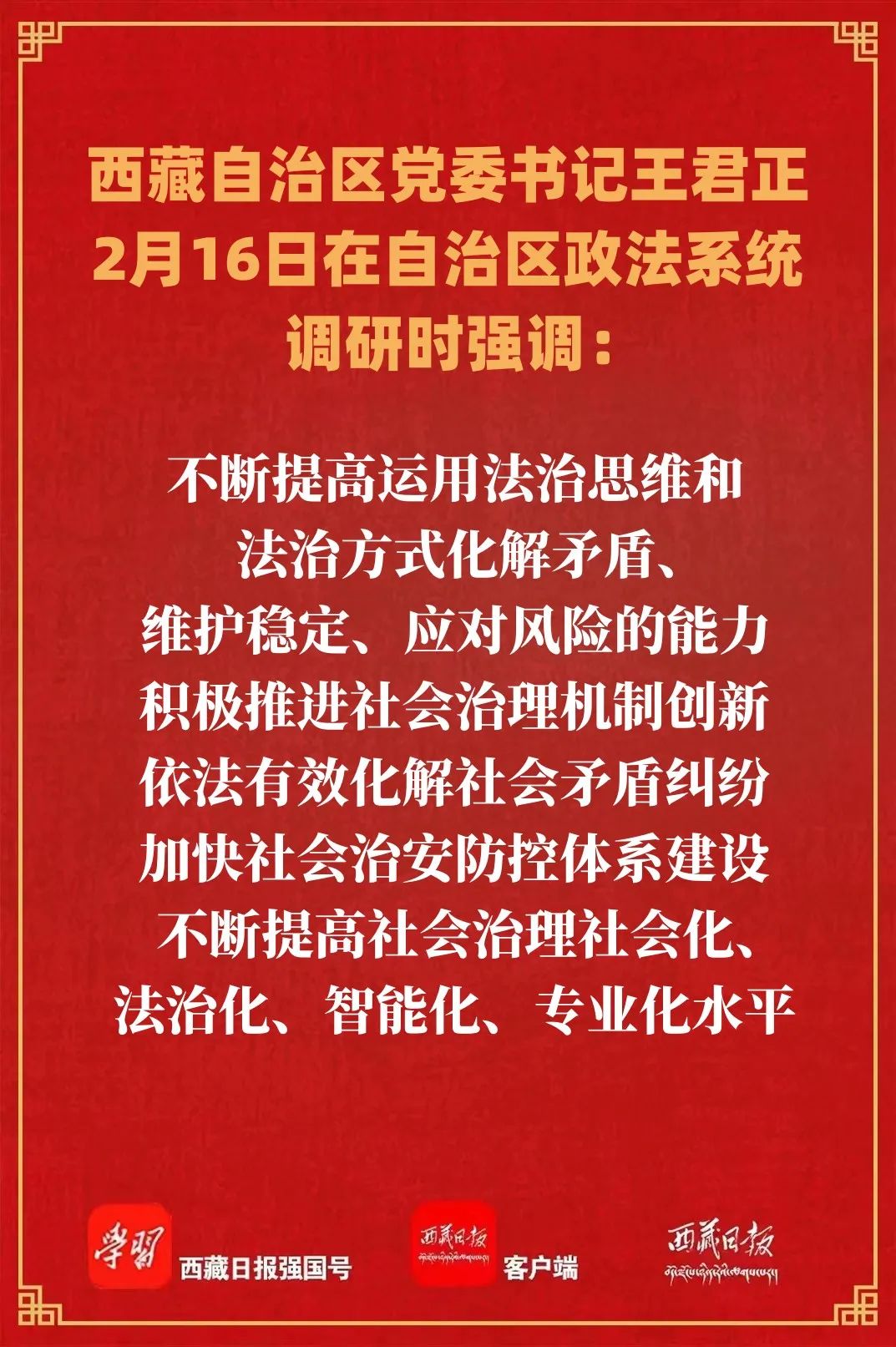 2月16日上午,自治区党委书记王君正在自治区政法系统调研。强调,要全面贯彻落实习近平总书记关于西藏工作的重要指示和新时代党的治藏方略,坚持和加强党的全面领导,坚持依法治藏,强化依法治理,不断提升社会治理体系和治理能力现代化水平,努力推动西藏长治久安和高质量发展。