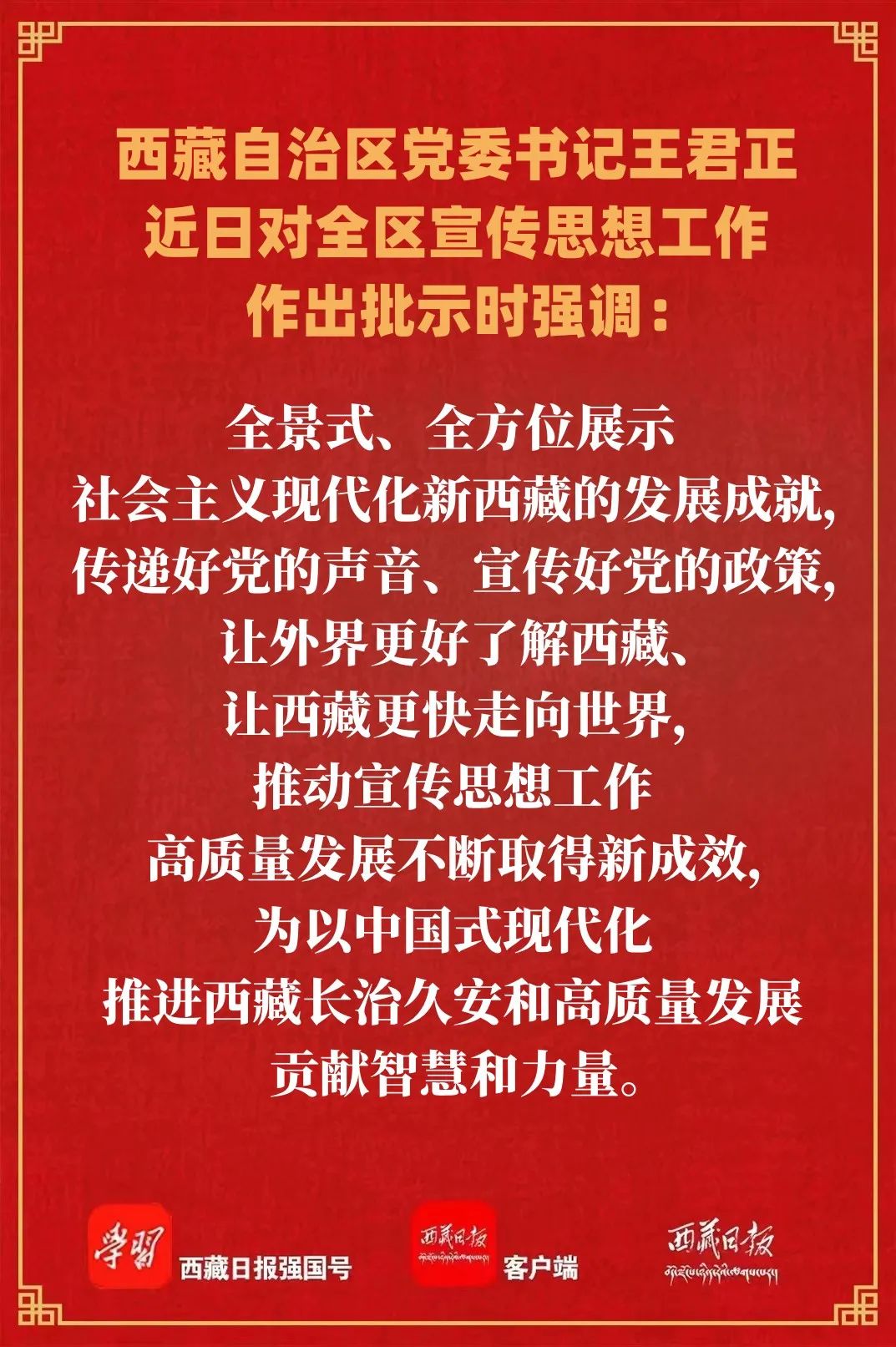 王君正指出,2022年,全区宣传思想战线认真学习贯彻习近平总书记关于宣传工作、西藏工作的重要指示和新时代党的治藏方略,围绕迎接宣传贯彻党的二十大这条工作主线,在重大主题宣传报道、巩固壮大主流舆论、加强精神文明建设、强化意识形态工作、网络舆情处置等方面做了大量卓有成效的工作,为全面建设社会主义现代化新西藏提供了坚强思想保证和强大精神力量。