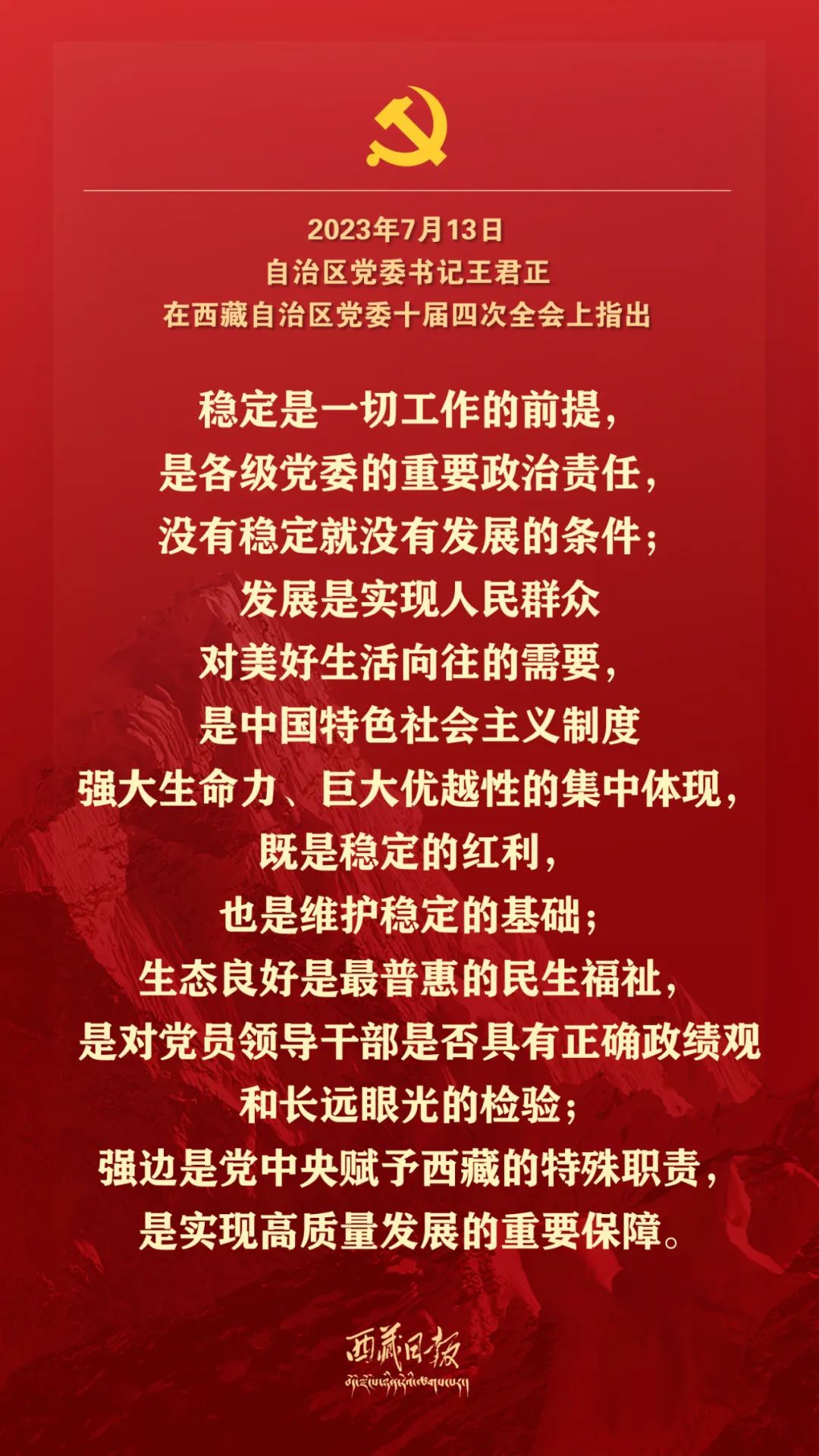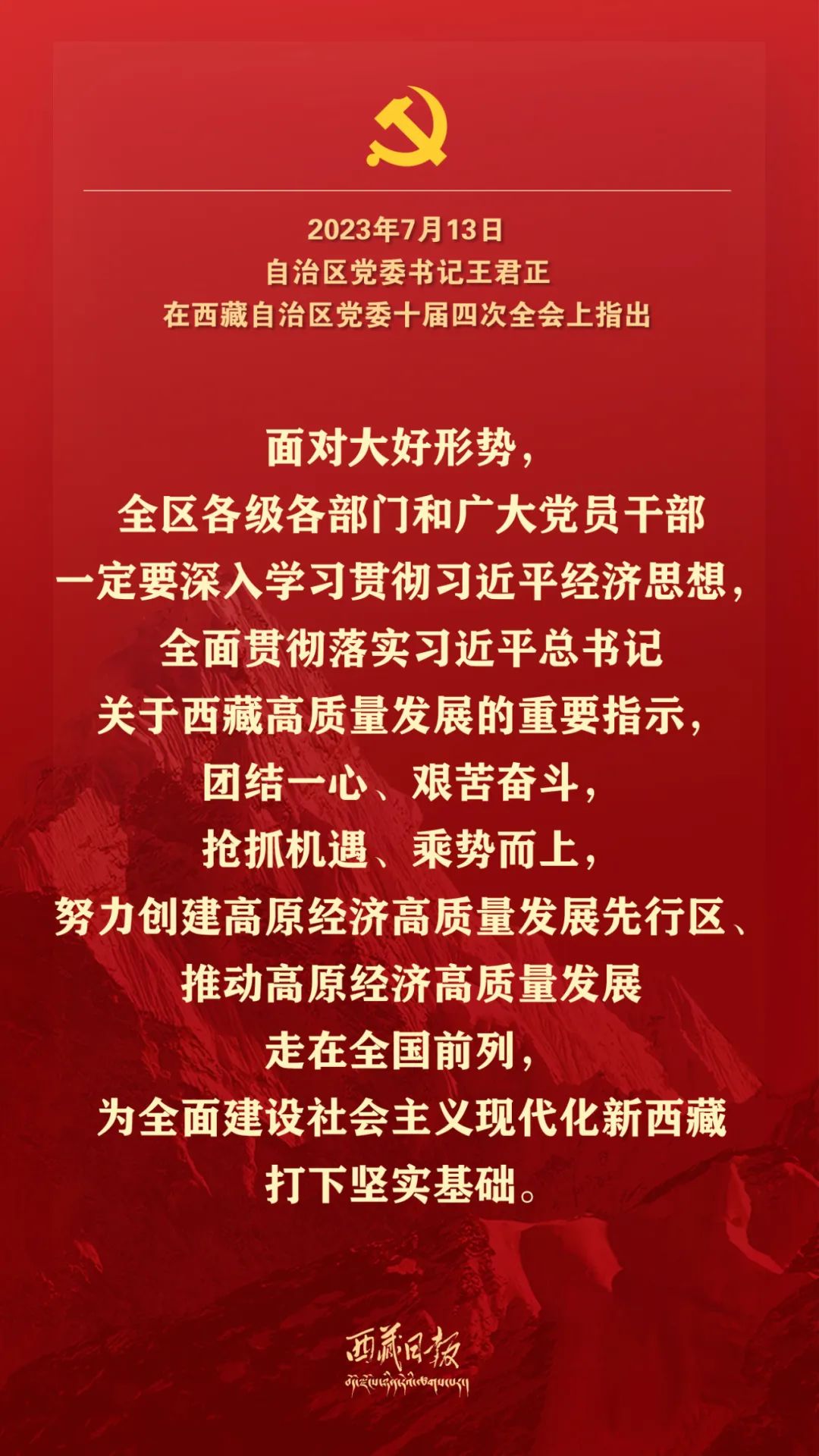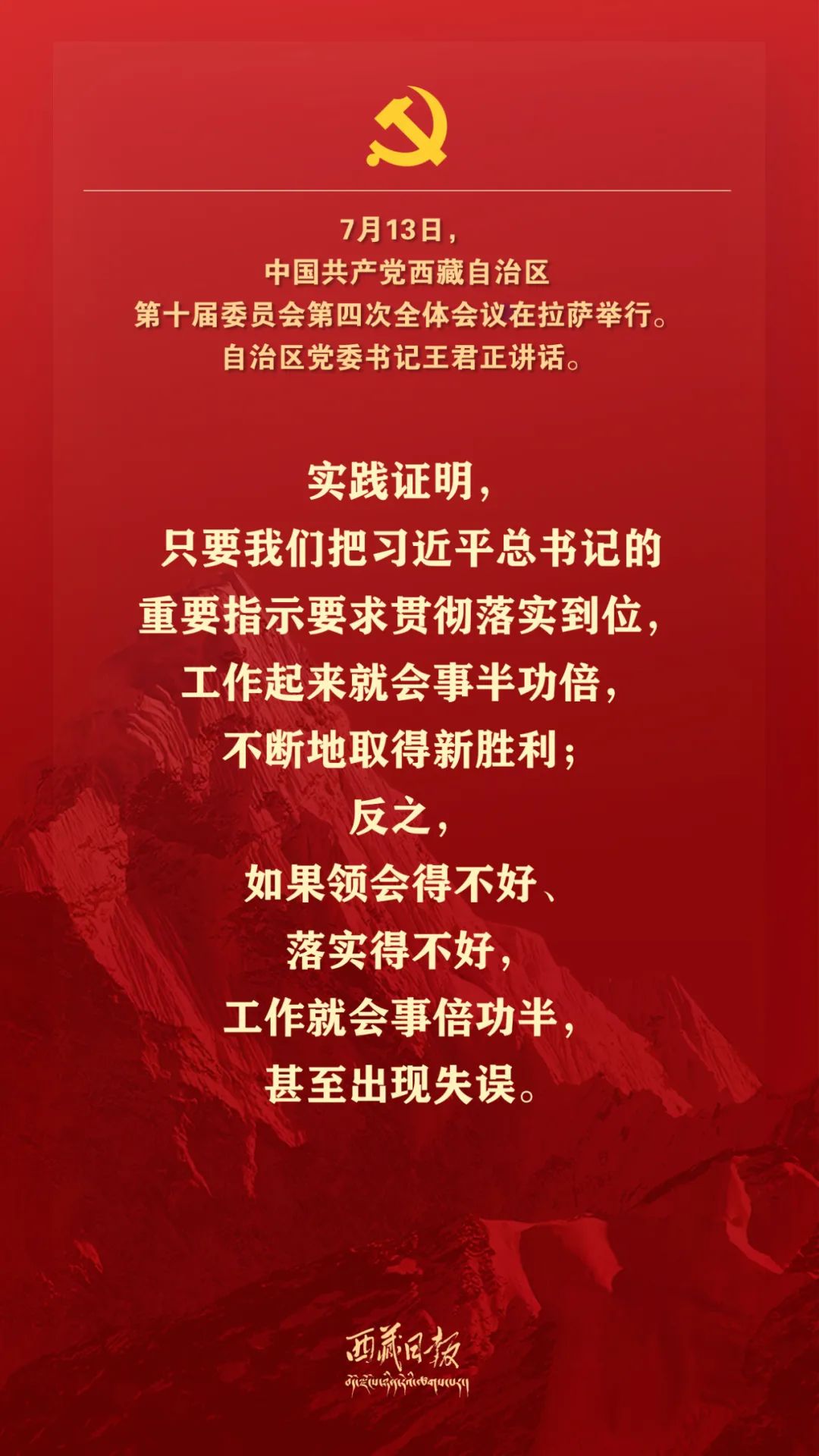 7月13日,中国共产党西藏自治区第十届委员会第四次全体会议在拉萨举行。全会由自治区党委常委会主持。自治区党委书记王君正讲话。