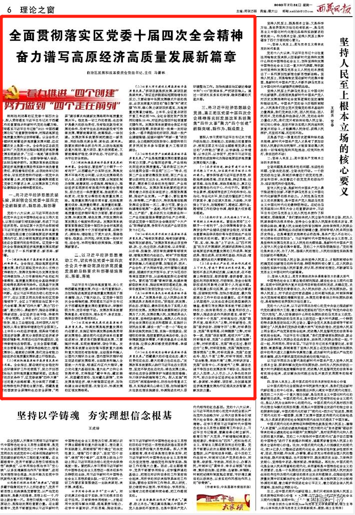 自治区第十次党代会深刻领悟习近平经济思想的科学体系和丰富内涵,创造性提出着力创建高原经济高质量发展先行区、努力做到高原经济高质量发展走在全国前列的宏伟目标。区党委十届四次全会围绕高原经济高质量发展实现新进步提出了一系列新要求、新思路、新部署。