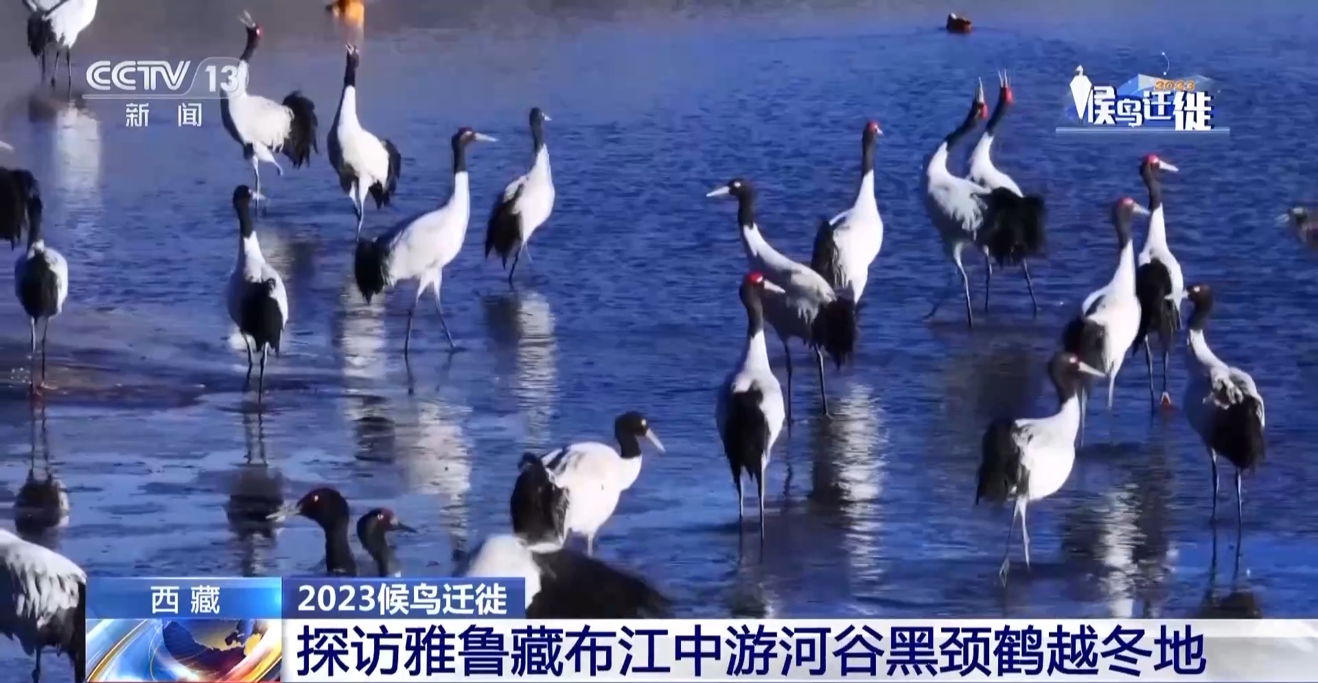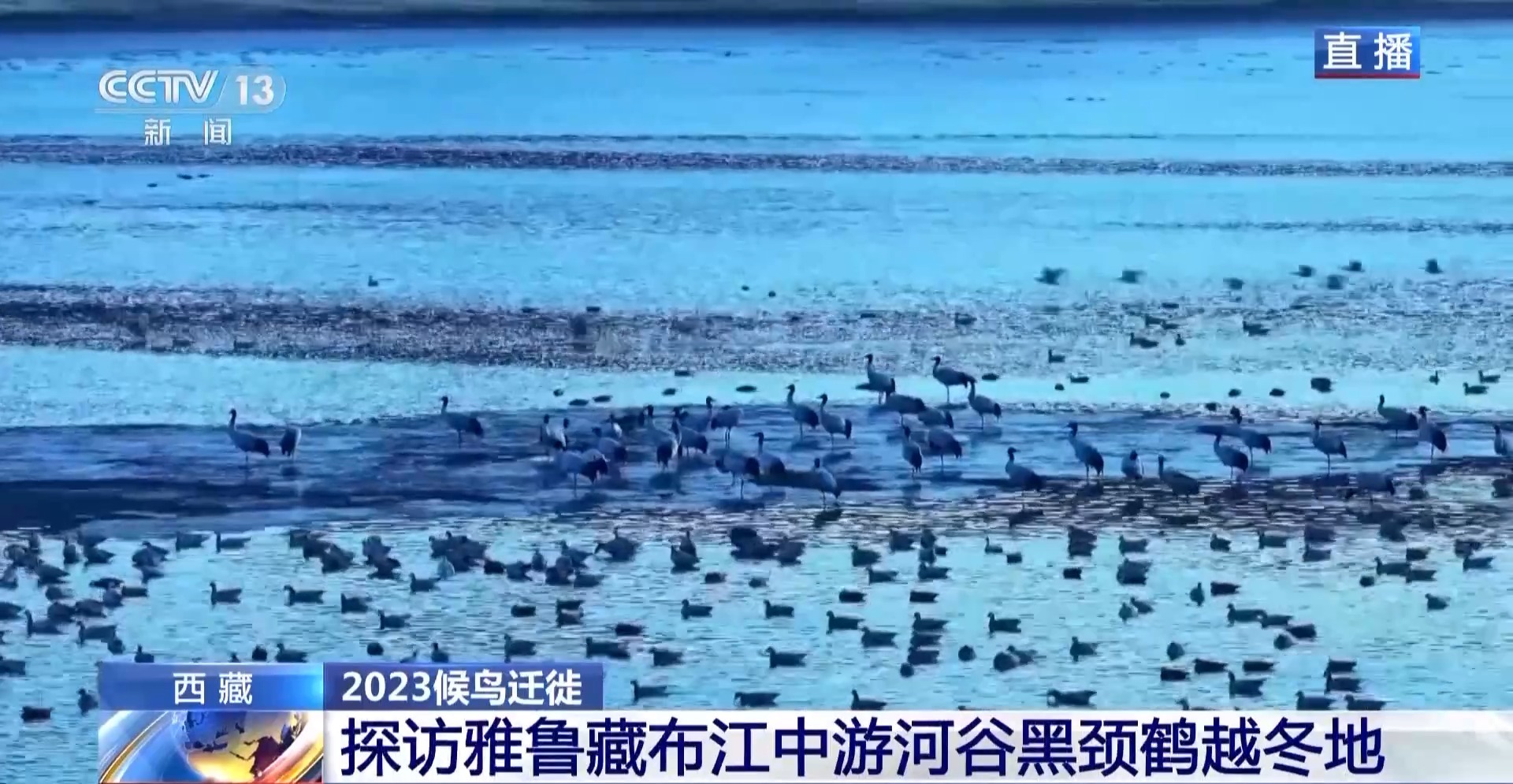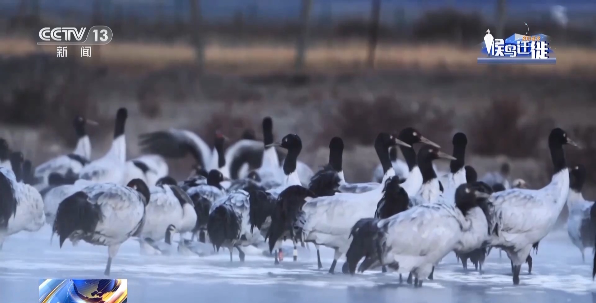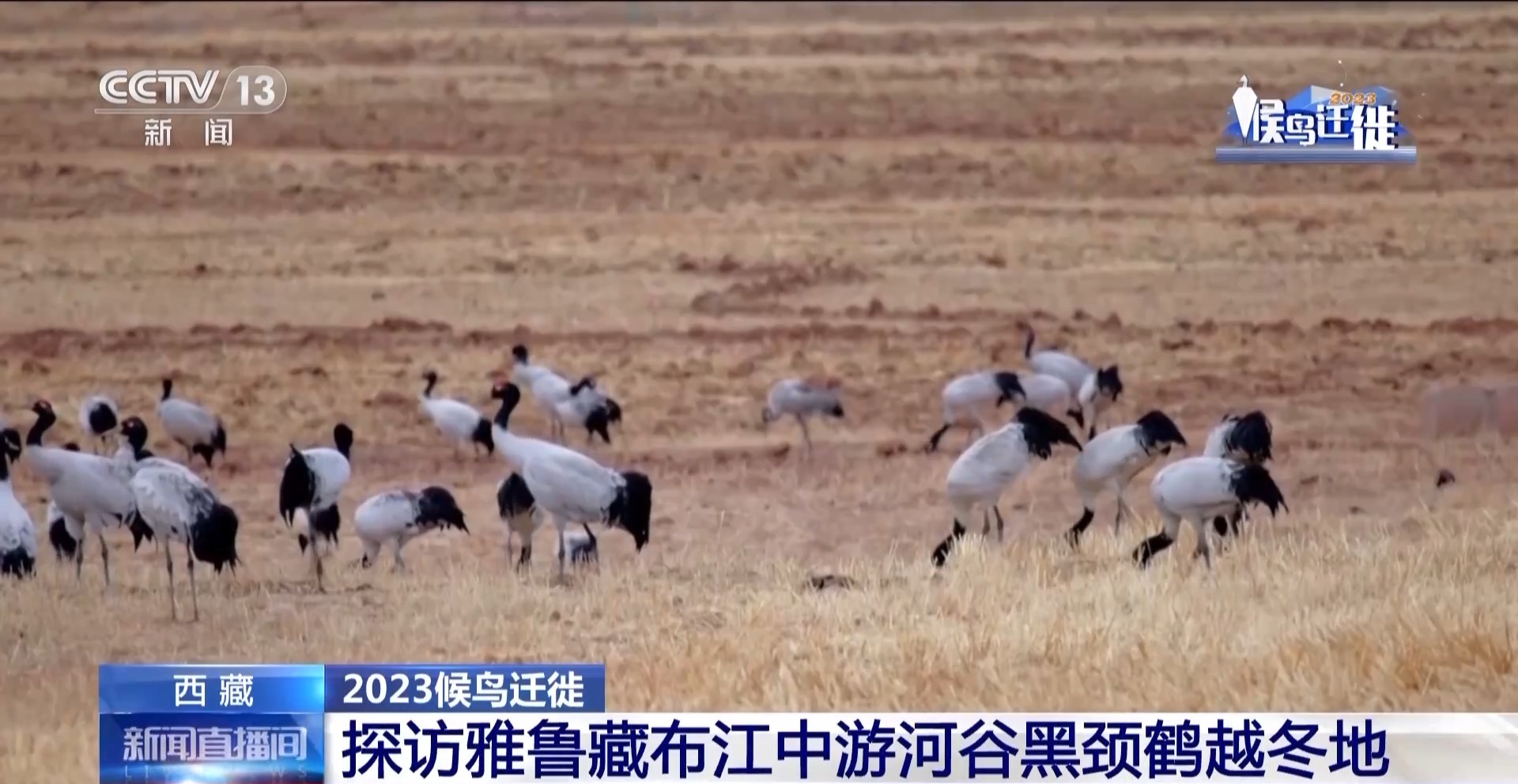 总台记者 普布次仁:随着来这里越冬黑颈鹤数量的增加,一旦遇到冬季突降大雪,黑颈鹤也会出现短期觅食困难,近年来,林周县林草部门依据监测情况和黑颈鹤栖息特点,经过科学评估,分别在春堆乡、卡孜乡、强嘎乡等地建立了10个投食点。每年会不定期在投食点投食青稞、冬小麦等,适当补充黑颈鹤的食物。随着大批黑颈鹤的到来,雅江中游河谷,又迎来了冬日里勃勃生机,呈现出鹤舞翩跹的生态美景。