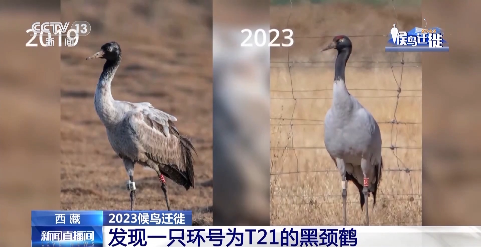 总台记者 普布次仁:这几天,科考队员还在林周县卡孜乡发现了一只环号为T21的黑颈鹤,它的双腿分别有环志和卫星追踪定位器。经过与北京林业大学郭玉民教授反复比对,确认这只黑颈鹤就是2018年8月在甘肃盐池湾国家级自然保护区环志跟踪的黑颈鹤T21。五年多的时间,能够再次拍摄到它的身影,非常难得。据介绍,当时环志的时候,黑颈鹤T21还是一只出壳不到100天的幼鸟。不过,现在,它已经是顶立门户的五岁成年鹤了,此次是跟家人来西藏林周越冬的。