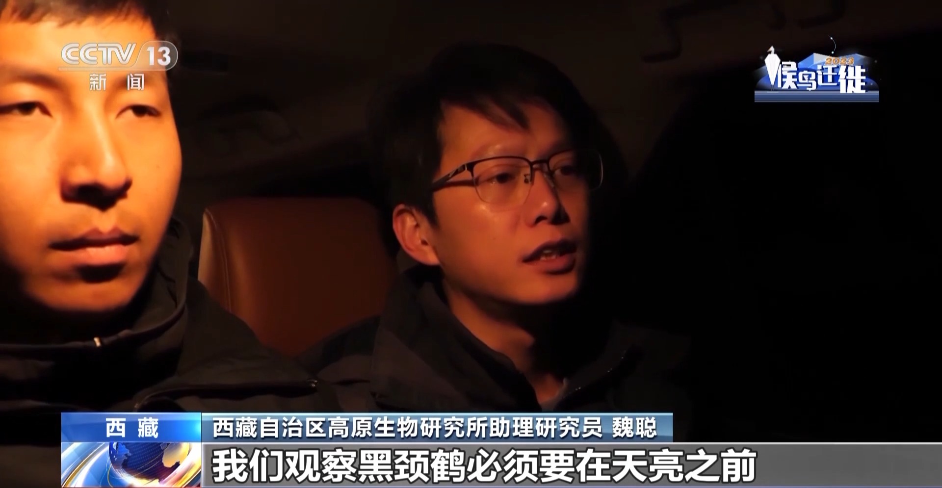 西藏自治区高原生物研究所助理研究员 魏聪:我们观察黑颈鹤必须要在天亮之前,因为天亮之后,鹤就要从夜宿地飞到附近的农田里面去觅食,如果它飞出去了之后,我们再去调查黑颈鹤,数量上可能就不是那么准确。