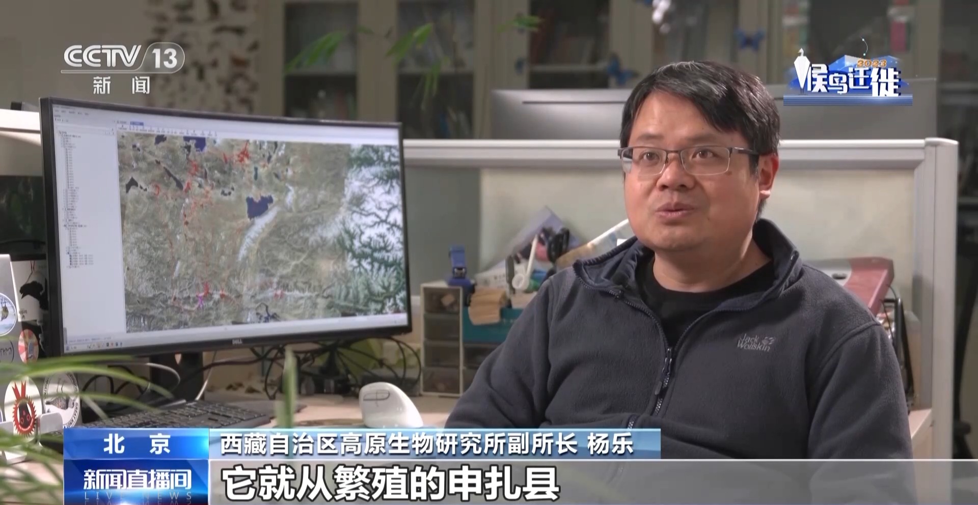 西藏自治区高原生物研究所副所长 杨乐:目前我们看到的色林错这个区域的黑颈鹤最快的可能只需要花2个小时到4个小时,它就从繁殖的申扎县然后到达越冬的南木林县或者是桑珠孜区附近尼玛县,然后往南边到达拉孜的扎西岗乡。