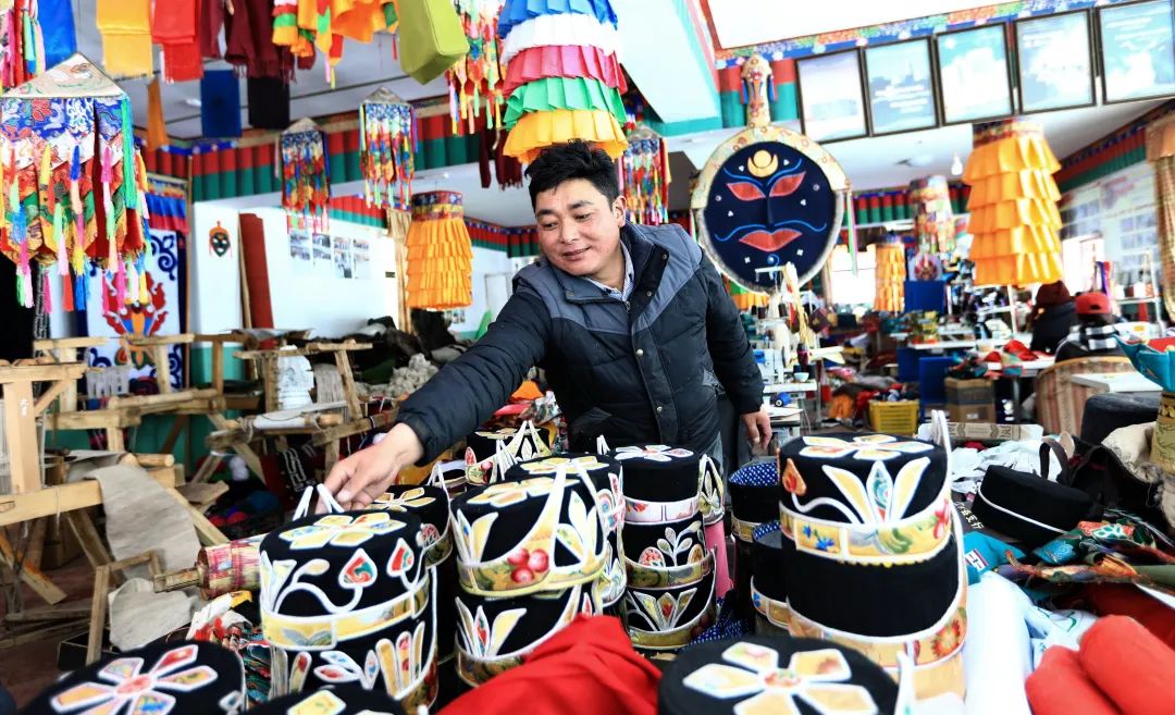 图为拉萨市墨竹工卡县尼玛江热朗瑕传统专业合作社负责人在整理做好的直孔氆氇帽。洛桑克珠 唐斌 摄 (资料图)