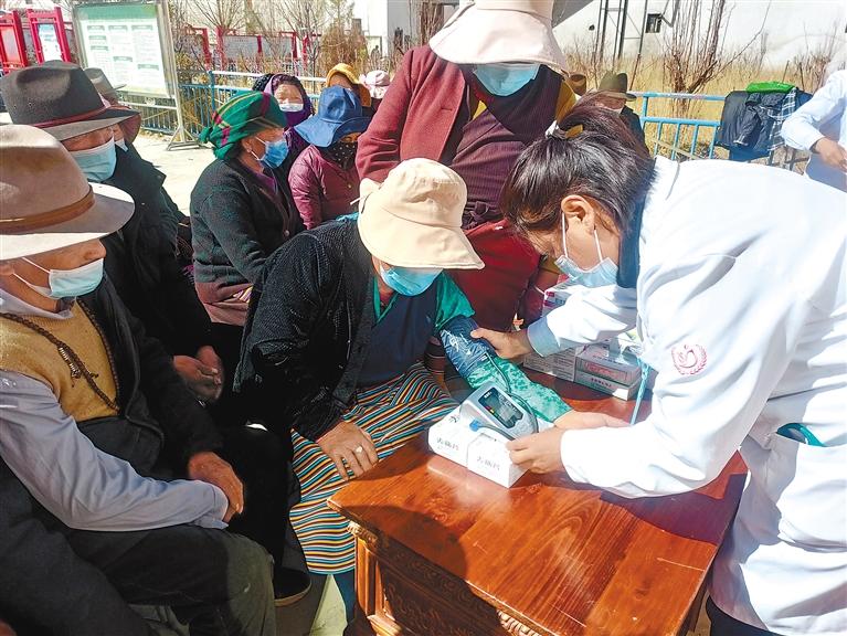 近日,共青团拉萨市委员会联合西藏阜康健康管理中心、西藏明廊永视眼镜连锁店、西藏奇正藏药股份有限公司,在尼木县塔荣村和日措村举办“建设文明乡村你我同行”送温暖系列活动。 图为医护人员为群众提供送医送药服务。 记者 央金 摄