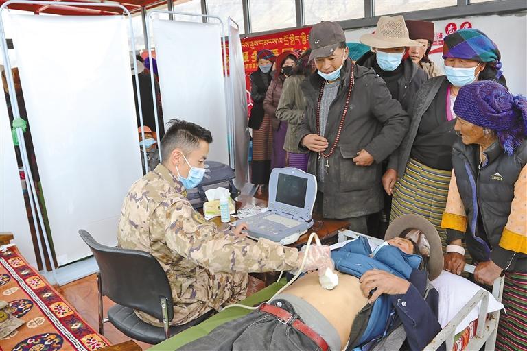 图为医务人员利用便携式B超机为当地群众检查身体。记者 格桑伦珠 摄