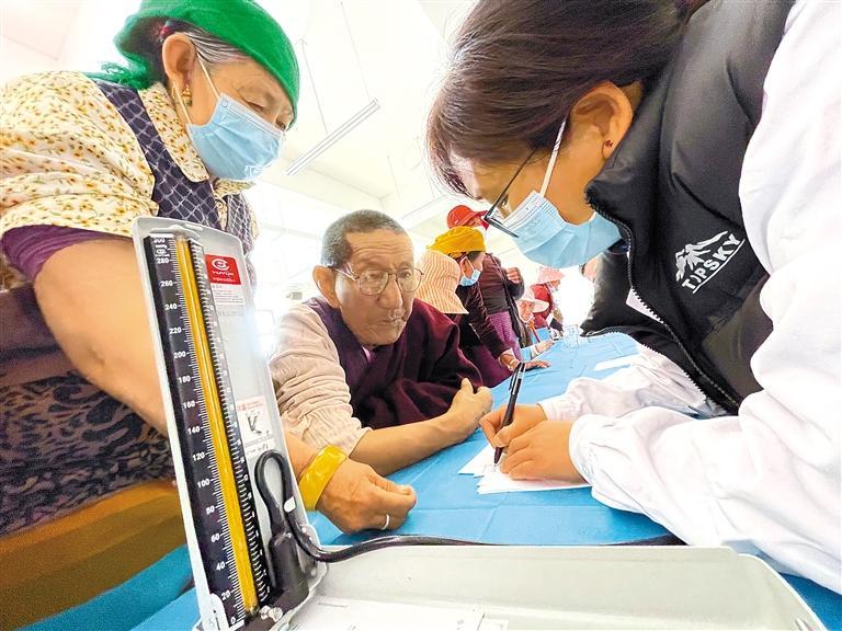 图为义诊活动中,医护人员为群众测量血压。记者 次旺 摄