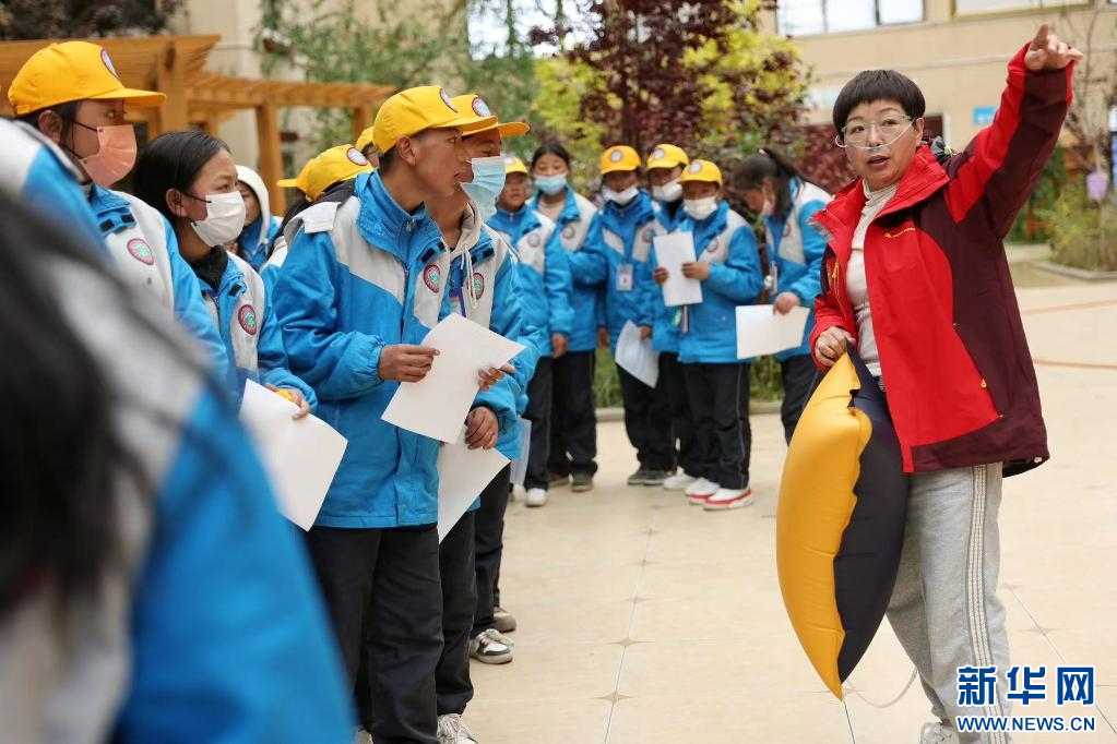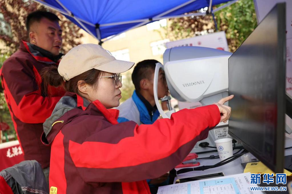 在西藏自治区那曲市色尼区第二中学(杭嘉中学),志愿者陈春玉正在引导学生排队验光(6月22日摄)。新华社发(赵颖硕 摄)