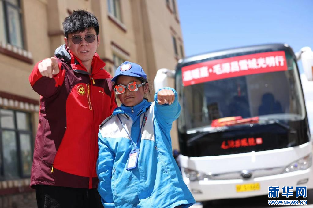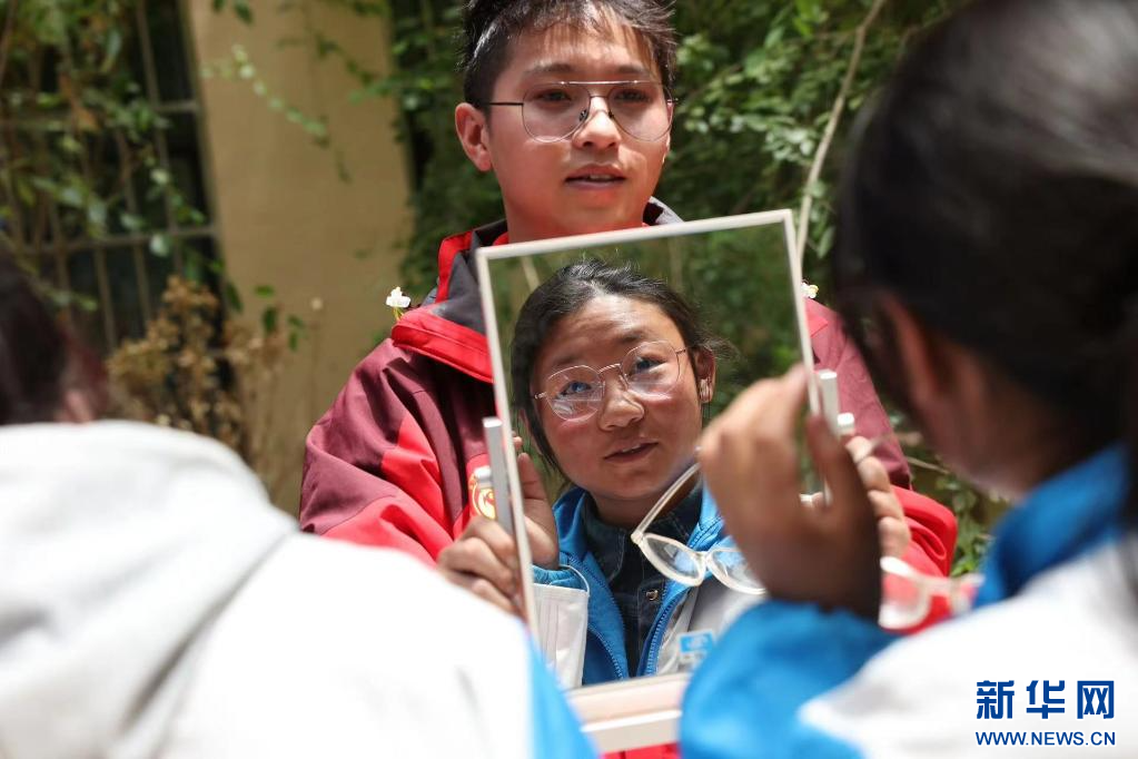 在西藏自治区那曲市色尼区第二中学(杭嘉中学),志愿者狄璐琬正引导戴上试戴架的学生适应眼镜清晰度(6月22日摄)。新华社发(赵颖硕 摄)