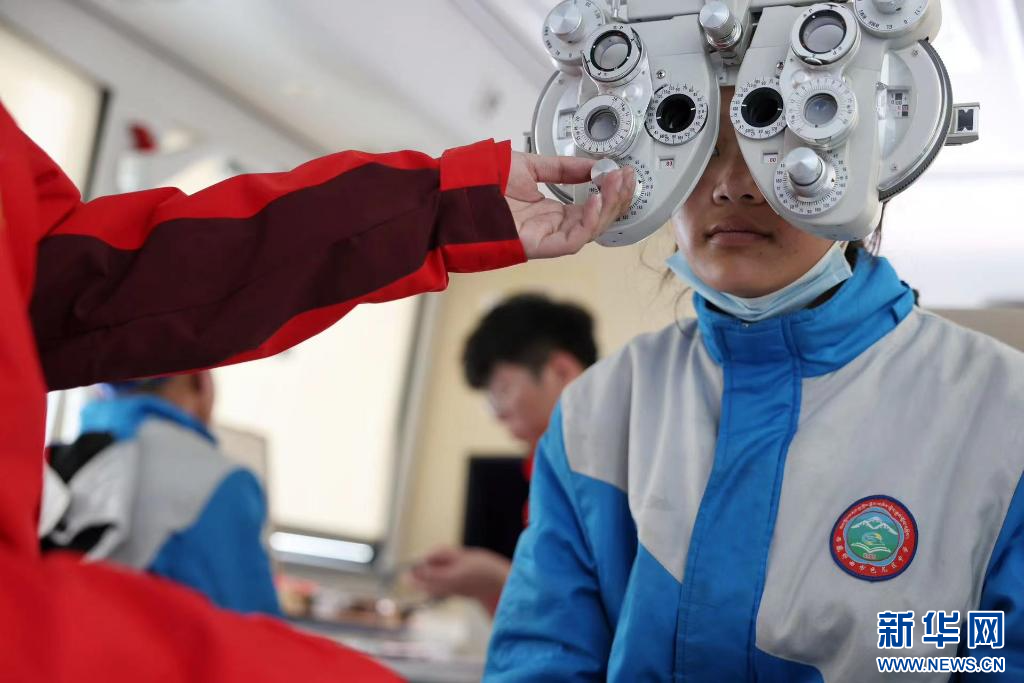 在西藏自治区那曲市色尼区第二中学(杭嘉中学),志愿者用综合验光仪为学生验光(6月22日摄)。新华社发(赵颖硕 摄)