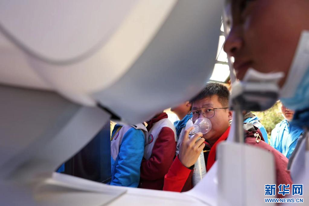 在西藏自治区那曲市色尼区第二中学(杭嘉中学),志愿者陈坤一边吸氧一边为学生验光(6月22日摄)。新华社发(赵颖硕 摄)