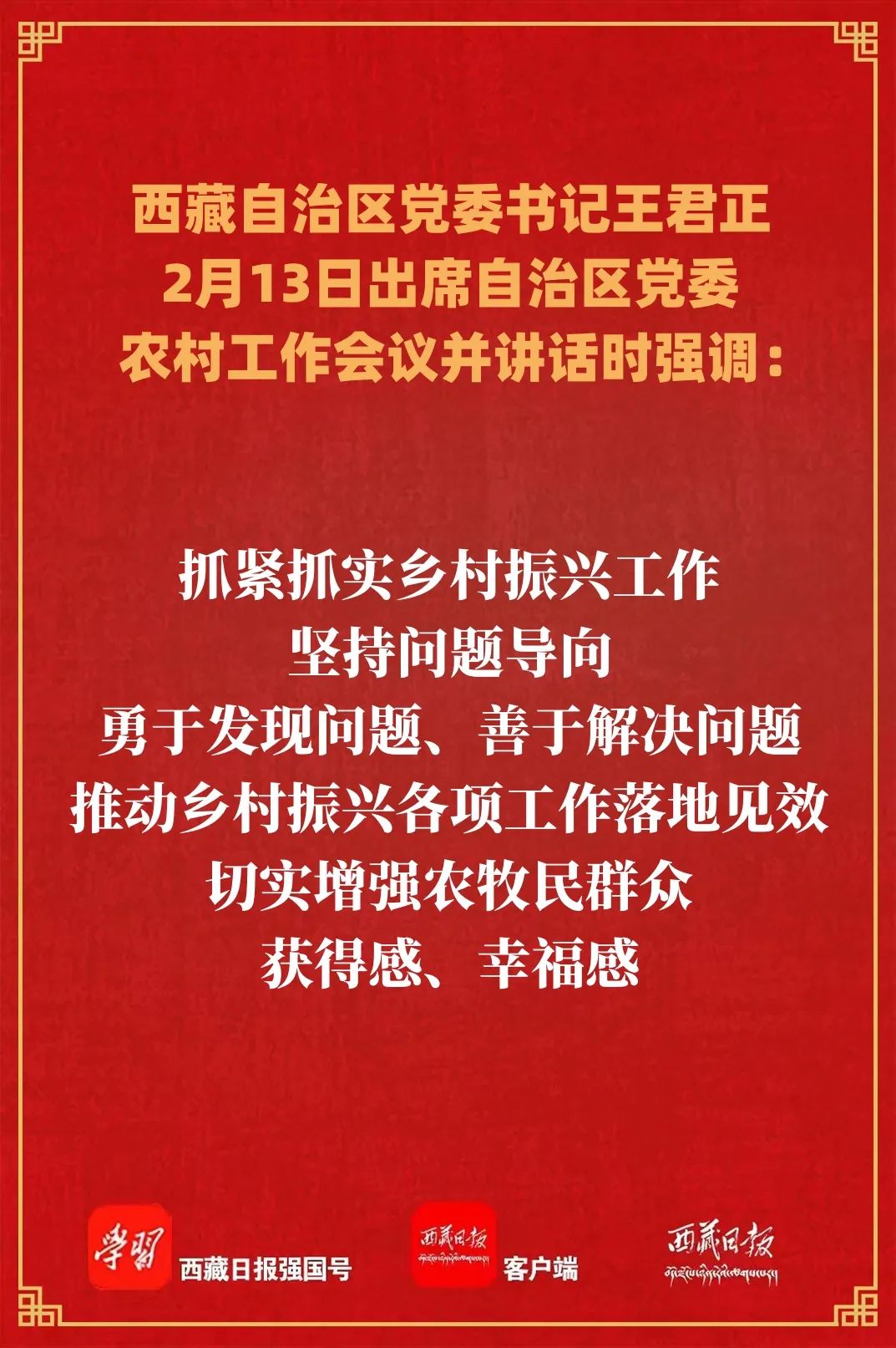 要全面推进乡村振兴。抓紧抓实乡村振兴工作,坚持问题导向,勇于发现问题、善于解决问题,推动乡村振兴各项工作落地见效,切实增强农牧民群众获得感、幸福感。巩固拓展脱贫攻坚成果,严格落实“四个不摘”要求,强化防止返贫动态监测帮扶,及时化解各类返贫致贫风险隐患。加快推进农业产业化,推动农畜产品精深加工,大力培育乡村旅游、休闲农业、农村电商等新产业新业态,形成产业发展新增长极。积极培育新型农牧业经营主体,注重引进一批农牧业产业化龙头企业,建强农牧民专业合作组织,让农牧民群众共享改革发展成果。努力打造高原农牧特色品牌,解放思想、创新作为,增强商品意识,做好做优“土特产”文章,做大做强“藏字头”品牌,推进高原特色产业高质量发展。