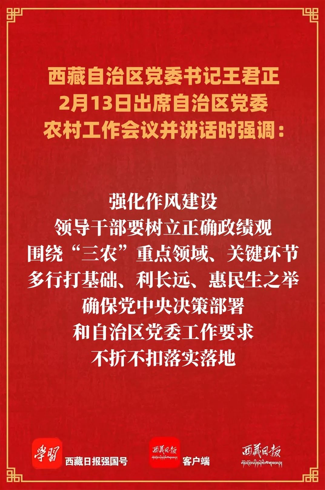 王君正充分肯定过去一年全区“三农”工作取得的成效。他指出,2023年是加快建设农业强国的起步之年,全区各级各部门要坚持以习近平新时代中国特色社会主义思想为指导,深入贯彻党的二十大精神,着力在“稳粮、兴牧、强特色”上下功夫,把振兴农牧区、发展农牧业、富裕农牧民放在优先位置,突出农牧民增收中心任务,强化科技创新和农村改革,守牢确保粮食安全、防止规模性返贫底线任务,扎实推进乡村发展、乡村建设、乡村治理等重点工作,为全面建设社会主义现代化新西藏打下坚实基础、提供有力支撑。